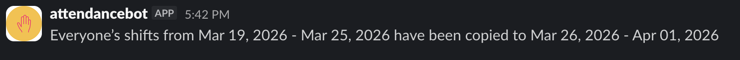 To Copy Shifts for a user, please head to your Settings Panel by typing settings to the bot. Once you are in the Settings Panel, please navigate to Time Tracking-->Shift Management-->Create & View shifts and you'll find a weekly view of the shifts created for your team.