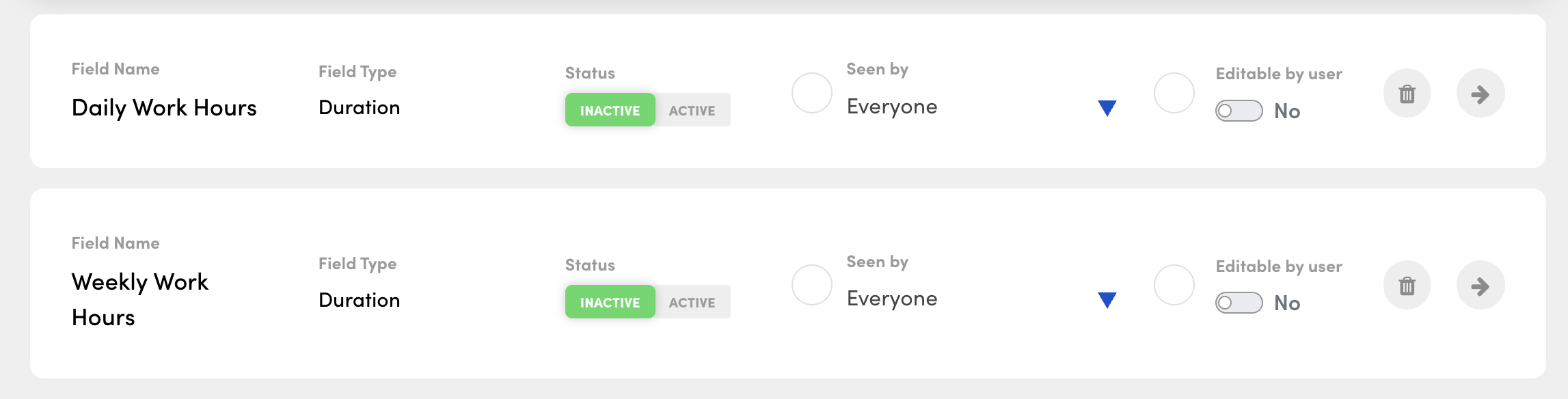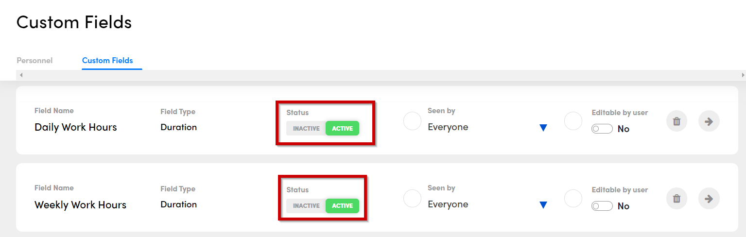 - Visit the custom field section of your personnel dashboard and browse the relevant fields for "work hours". You will want to "activate" any work hour periods you need, chosen between "Daily Work Hours," "Weekly Work Hours," "Biweekly Work Hours," and "Monthly Work Hours."
