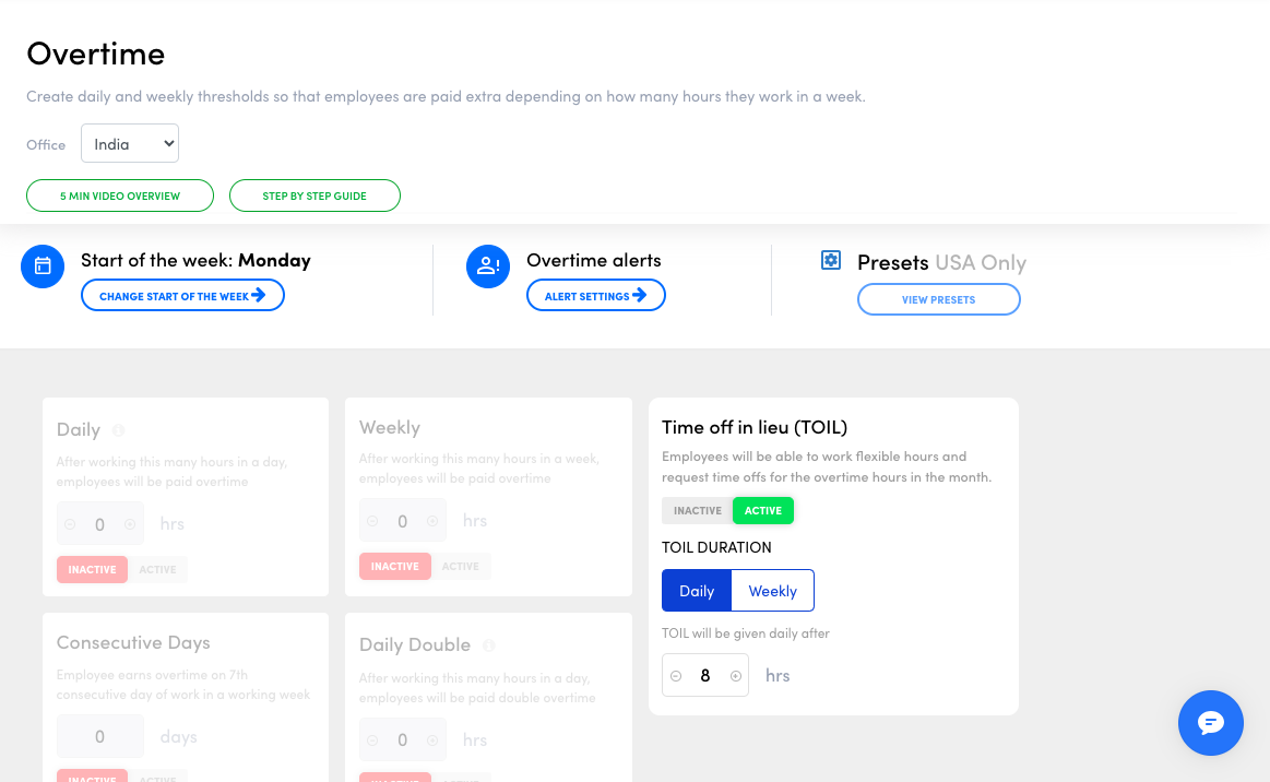 - If your operations are based in the US, you may also select between state-by-state overtime presets from the top right present menu.