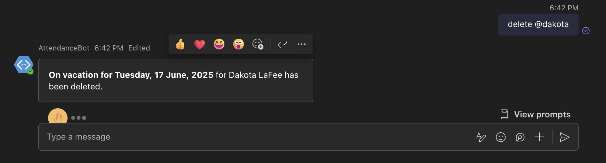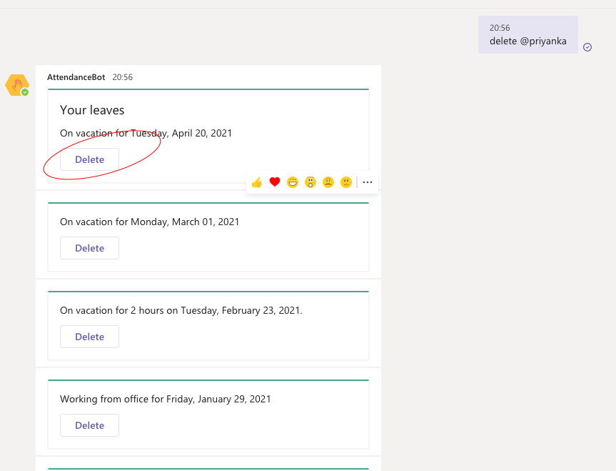 1. To delete a leave applied by a member of your team, please type the command "delete @username" to the AttendanceBot where "@username" is the name of the team member.