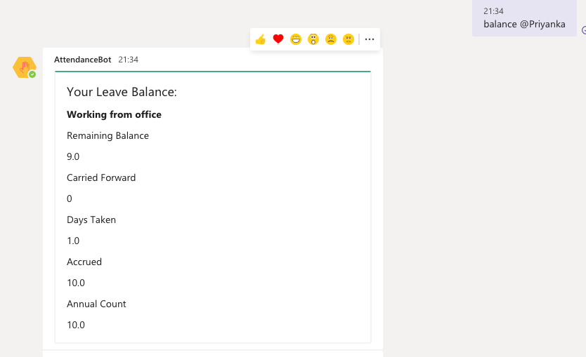 The balance for each leave will be displayed along with additional details like "Carry forwarded", "Days Taken", "Accrued" and the "Annual count" etc.