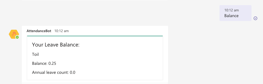 - Employees can check the number of hours they can avail in lieu of overtime by typing “balance”.