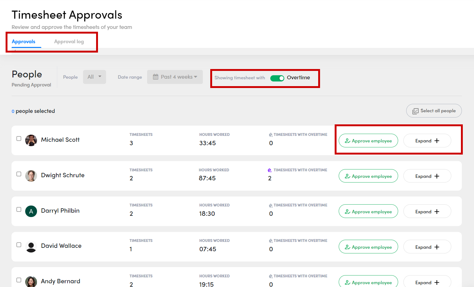 The approval page will be organized into two tabs - pending approval “Approvals” and already approved “Approval log”. Both tabs are organized by employee, with each employee being represented by their own tile summarizing the number of timesheet periods and hours either approved or unapproved.
