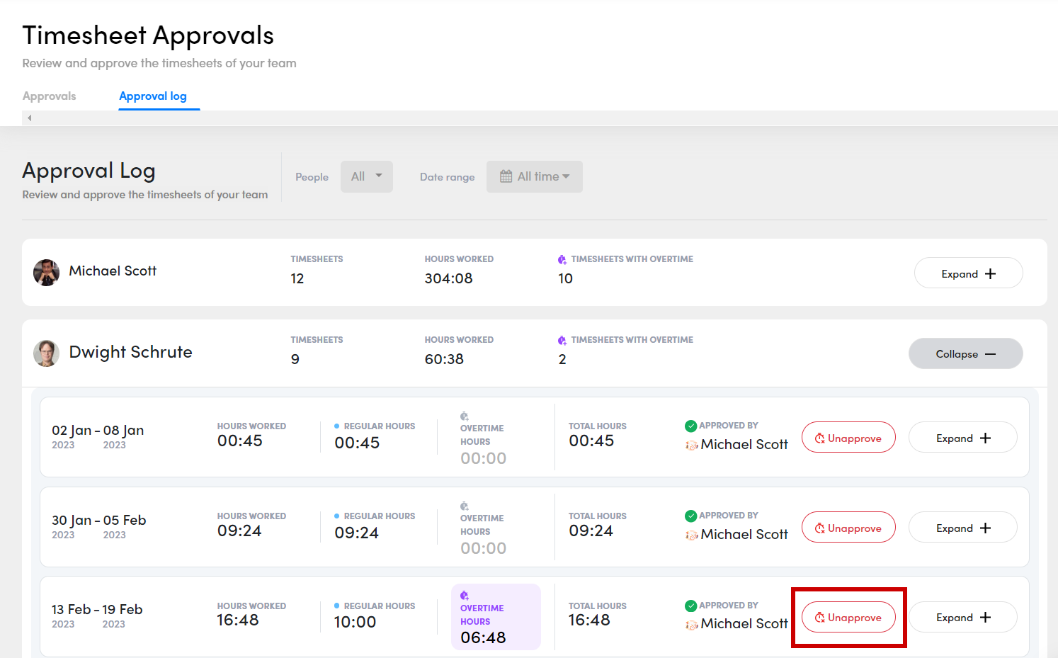 Use the aforementioned “approval log” tab, where you can view the historical approved timesheets for employees. To unapprove a timesheet, select the employee, click “Expand,” and you’ll see the option to “Unapprove” for the specified date range.