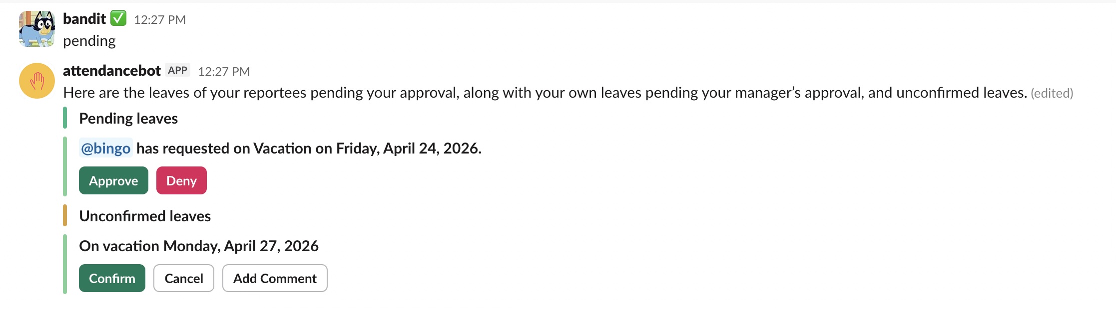 3. Leave requests that you haven't confirmed. AttendanceBot always needs a final "Confirm" button click to record your leave requests. If you have some requests that are not confirmed, then those will show up here).